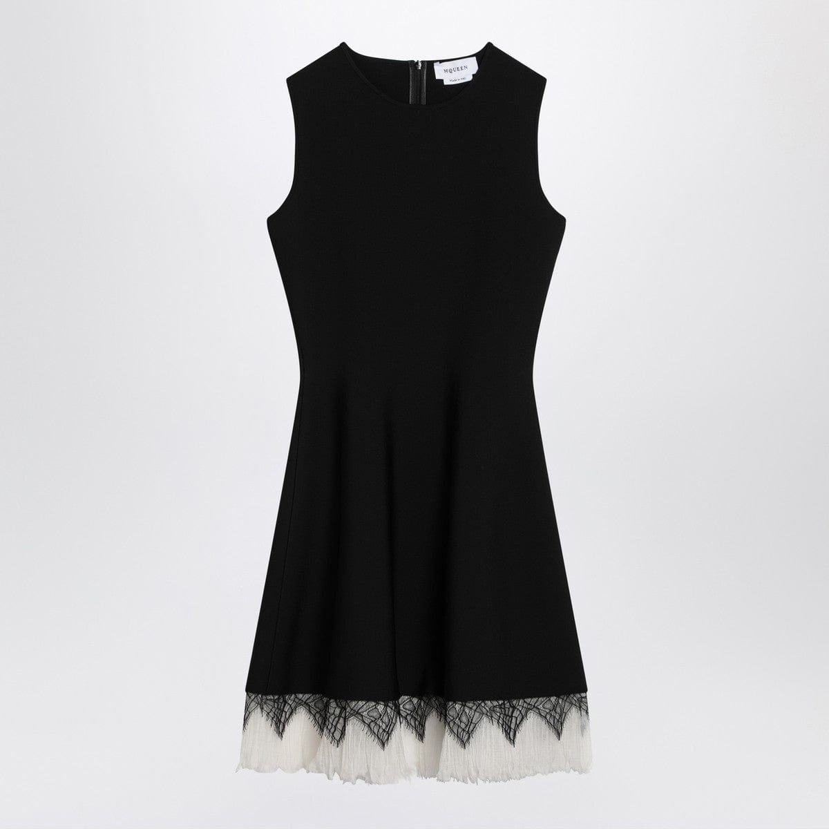 Sleeveless crew neck dress by Alexander McQueen in black stretch viscose, characterized by a flared skirt, black spider web lace finishes, ivory silk creponne at the bottom, and a zip closure at the back.