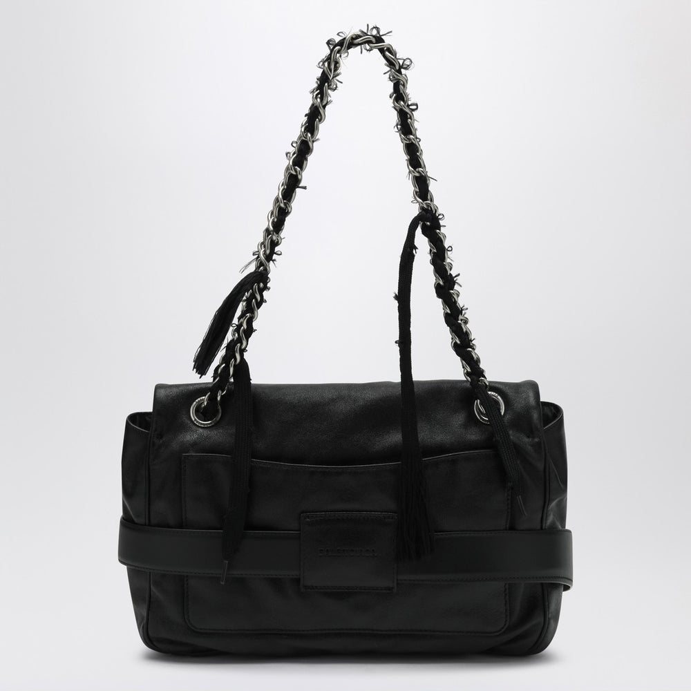 Balenciaga black leather shoulder bag, featuring a chain shoulder strap, front flap with turn-lock closure, metal logo plate, one central compartment, one internal zip pocket, and one front flat pocket.