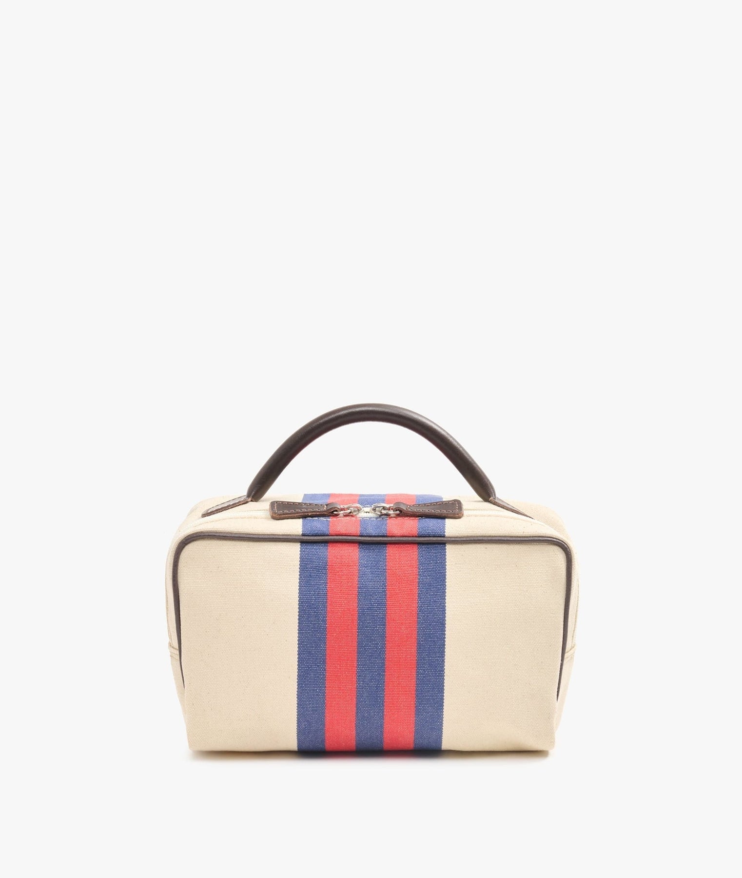 The Berkeley Rugby Beauty Case, a best-selling beauty case, is the perfect travel accessory. Made from cotton, the Rugby version from the FW24 winter collection features four central printed stripes that alternate two different colours, a rigid handle and zip pulls made from dark brown leather, a zip and a waterproof inner lining with an integrated pocket. Our cream-coloured Berkeley Rugby beauty case with red and blue stripes can be embroidered to create the perfect travel accessory.