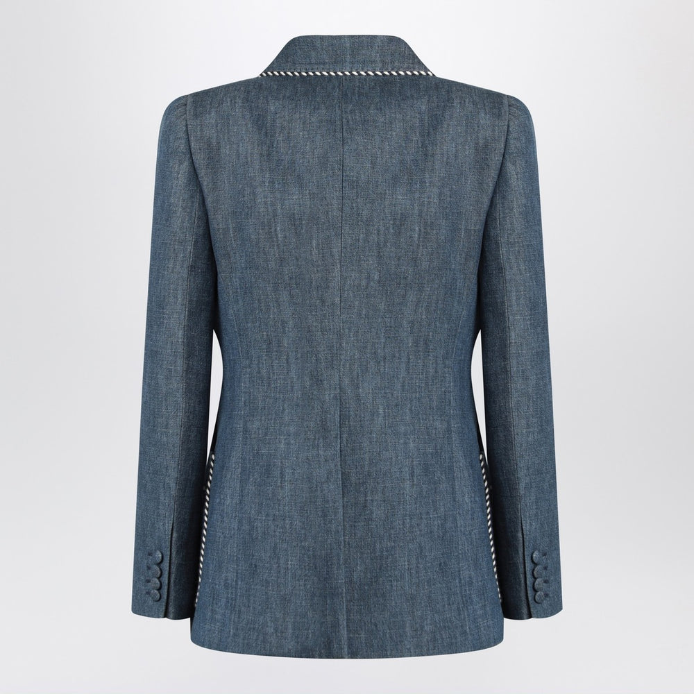 Double-breasted jacket by Valentino in blue chambray denim, featuring front closure with Vlogo buttons, long sleeves with buttoned cuffs, one welt pocket on the chest, two patch pockets on the front, peak lapels, contrasting striped trims, and back vent. Size and Fit - Model wears size 40 IT Model measurements: Height: 178 cm Chest: 83 cm Waist: 63 cm Hips: 91 cm